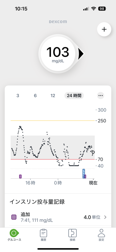 朝起きて動き回ってたら、デクスコムに血糖値103とか表示されてた。これは普通の数値!