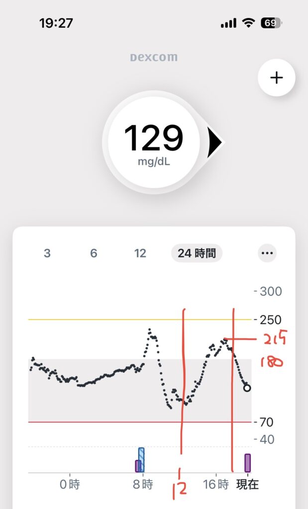 24時間の表示のままの画像にしてしまって分かりづらいけど、今回の食事(昼食)での上下具合は赤線から赤線の間ですね。
