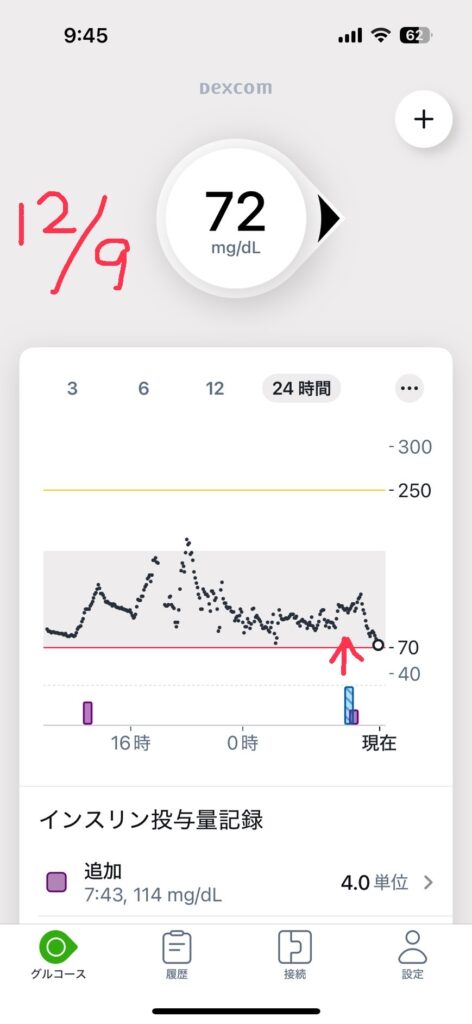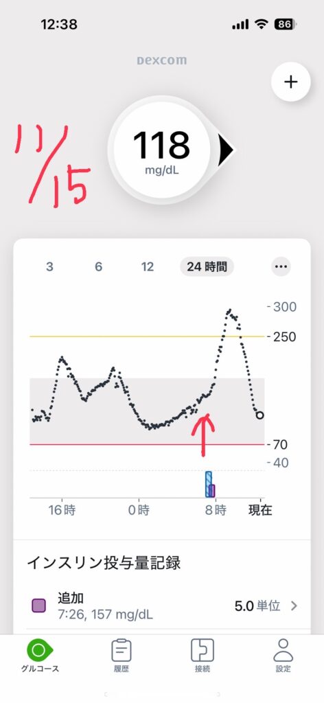私は1型糖尿病なので食前にインスリンを打っているのですが、3週間前は5単位打っていたのが、今は4単位になり、今日はこのあと低血糖レベルにまで落ちていったので、明日は3単位で様子を見てみようと思います。
